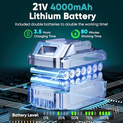 - 【Powerful Battery and Chain Adjustment】 This cordless mini chainsaw comes with two powerful 21V 4000mAh lithium batteries and a fast charger, providing a maximum operating time of 160–200 minutes. The battery is upgraded with a charge indicator, making it easy to check the remaining power. You can easily adjust the chain tension with our small screwdriver to ensure you’re always working efficiently.