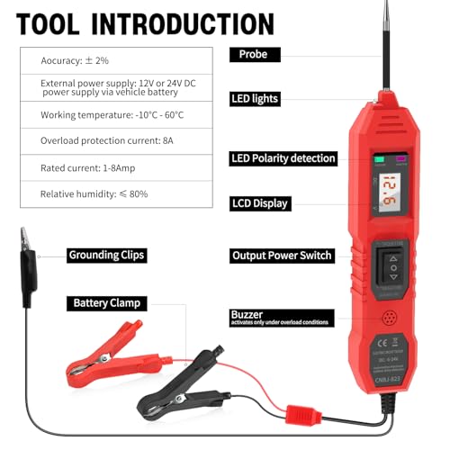 • 【All-in-One Circuit Tester】This multifunctional circuit tester is designed for a wide range of tasks, including voltage measurements, continuity testing, polarity checks, and component activation. Whether you're troubleshooting a dead battery, locating a short circuit, or testing relays and fuses, this tool delivers precise results, saving time and effort. Ideal for diagnosing both minor electrical problems and complex wiring faults. This tool helps identify the faulty wiring or component within minutes.