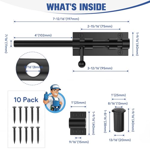 • 【Premium Barrel Bolt Latch】: The heavy duty door locks is made of high quality 304 stainless steel with black finish, elegant and beautiful look,rustproof, durable and wear-resisting, attached screws also apply the upgrade 304 stainless steel material to help fix the gate latch more deep and firm.