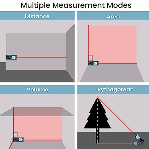 - 【Multiple Measurement Modes】Support distance, area, volume and Pythagorean modes, continuous measurement, addition and subtraction functions for quick calculations, and switchable units among ft/m/in for convenient conversion