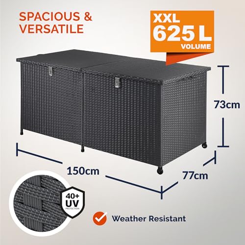 - HUGE STORAGE SPACE: The CASARIA garden storage box made of easy-care and very robust polyrattan weave offers 625L of storage space, perfect for shoe storage, enough space for cushions, pillows and other accessories. With dimensions of 150x77x73cm, even large lounger cushions fit easily into the box.