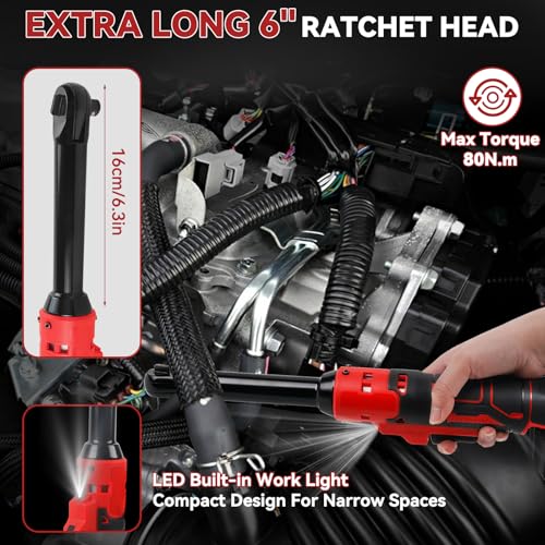 • Extended Headpiece: Featuring a 6.3-inch long neck and a compact 3/8-inch headpiece, this electric ratchet effortlessly accesses tight and narrow spaces, loosening or tightening nuts with ease. Unlike ratchets with shorter heads, the extended electric ratchet provides effective knuckle protection.