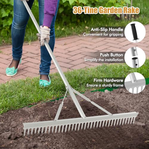 - 【2-Sided Rake Head】 The landscape rake has a 91 cm wide head to cover a large surface area, helping you complete gardening tasks with ease. Also, it boasts 2 different sides for leveling and landscaping, especially its 36 tines will highly improve efficiency.