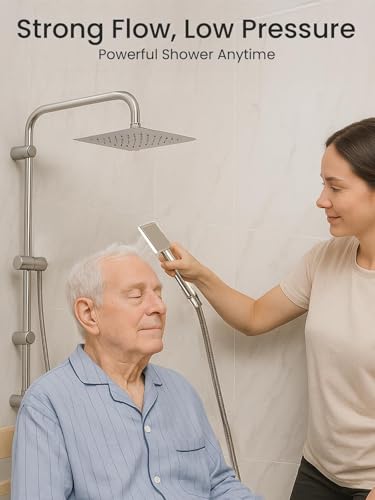 - [Easy to install and customize]The shower set comes with British G1/2 and G3/4 standard accessories, which is easy to install and the shower height is adjustable. The handheld shower can be easily turned on/off with the push of a button, and its direction can be adjusted to suit different heights.