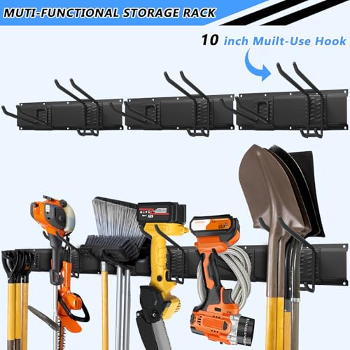 • 48 INCH ADJUSTABLE GARAGE WALL TOOL HOLDER: The entire length of the garage organizer wall mount is 48 inches. Equipped with 6 hooks and 3 rails, this adjustable gardening tool rack wall mount organizes all your garage/lawn/garden/tool storage to save floor space
