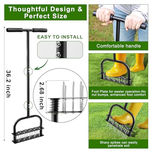 - [THOUGHTFUL DESIGN] Lawn aerator is made of iron with a rust-resistant powder coating. Its 34.6-inch length allows for lawn care without bending over. The T-shaped handle and padded foot lever make operation easy. Suitable for clay, sandy, and loamy soils, the thick footplate withstands full weight, and the integrated bottom structure is solid. The spacious footrest ensures stability, fits all shoe types, and prolonged use won't cause fatigue. The padded grip prevents hand fatigue or blisters.