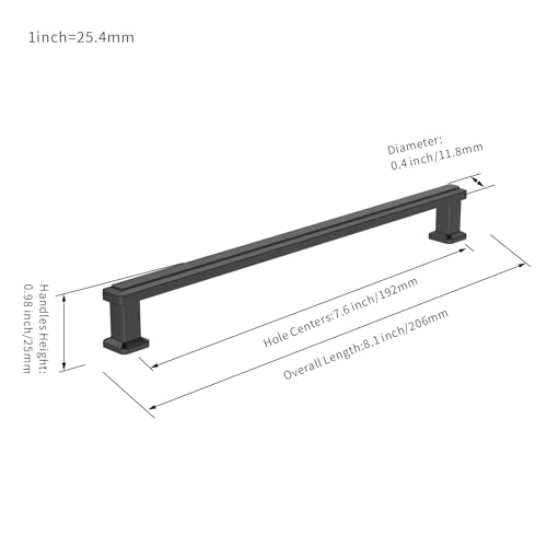- √Measurement:Hole centers:7.6inch/192mm;Overall length: 8.1inch/206mm;Handles width: 0.4inch/11.8mm;Handles height: 0.98inch/25mm.Please measure your cabinet or other applications HOLE CENTERS carefully before purchase.