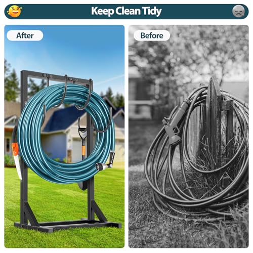 - Heavy Duty & Practical Tool Hooks: The hose holder can holds up to 150ft of garden hose with ease, plus features two practical rear hooks for hanging nozzles, gloves, or small garden tools, maximizing storage efficiency