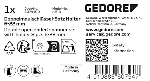- Box contents: 1x GEDORE double open-end spanner set (H 6-8), included spanner widths: 6×7, 8×9, 10×11, 12×13, 14×15, 16×17, 18×19, 20×22 mm