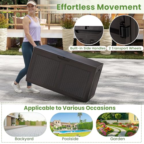 GiantexUK 380L Garden Storage Box, Waterproof Resin Deck Boxes with Lockable Sit-on Lid, Wheels & Gas Strut, Rattan Effect Outdoor Utility Chest Container for Patio Cushions Gardening Tools (Brown)
