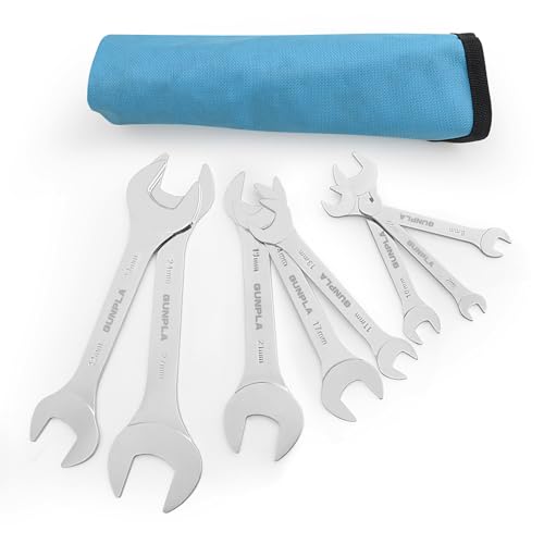 Gunpla Super-Thin Open End Wrench Set, Carbon Steel Flat Double Ended Ultra Slim Metric Spanner for Narrow Space, Mirror Polish Finish Tool Kit, 8 Pieces, 5.5-27mm, Storage Pouch with Printed Sizes