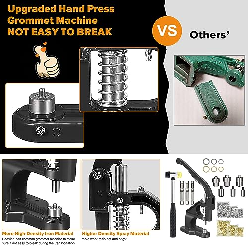- What You Will Get:Package include: 1pcs Heavy Duty Hand Press Eyelet Grommet Machine, 3Pcs Dies (0: 1/4, 2: 3/8, 4: 1/2) and 1500Pcs 3 Sizes (6, 10, 12mm) Sliver/Gold Grommets and 1 piece double heads rubber hammer.