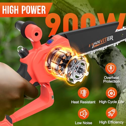 6&8 Inch mini chainsaw powered by a robust 900W motor, this mini chainsaw delivers 32ft/s chain speed for crisp, jam-free cuts through wood up to 15cm thick,Smooth, bark-friendly performance for firewood, pruning & DIY.