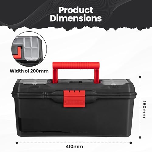 - 𝐒𝐓𝐔𝐑𝐃𝐘 𝐎𝐑𝐆𝐀𝐍𝐈𝐒𝐄𝐑 𝐁𝐎𝐗 – Our tool organisers feature a robust plastic locking clasp to keep your tools secure during transit, and a fold-away carry handle, making this large tool box durable and easy to transport around the home or to the work van.