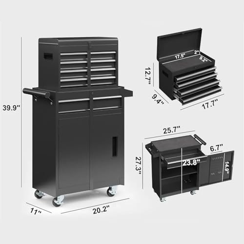 - 【Flexible 2-in-1 Design】Meet every workspace demand with our tool chest's detachable design, measuring 20.2" L x 11" W x 40" H. Split into a four-drawer box and a rolling cabinet for separate or combined use, and the top tool box neatly nests within the lower cabinet to maximize your space.