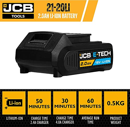 - JCB 18V 2.4A Fast Charger. Up to 120 min run time (5.0Ah)