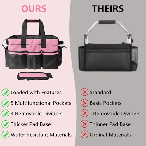 - 【Multi Pockets 】This pink cleaning bag features 4 removable padded dividers that convert the spacious main compartment into 5 customized sections, plus 5 exterior pockets. 3 front pockets can easily store some small item such as trash or paper, and 2 side pockets specifically intended for holding large bottles.