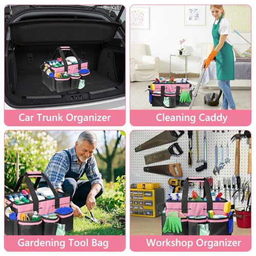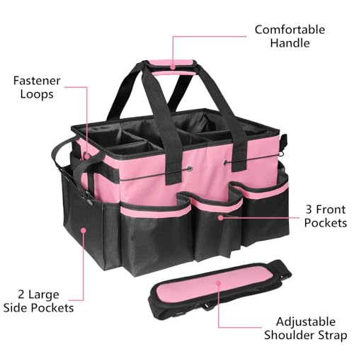 Jonuin Cleaning Caddy with Handle, Professional Cleaning Bag with Detachable Divide, Adjustable Shoulder Strap & Waist Belt, Large Cleaning Caddy for Cleaning Supplies, Home, Car, Garden, Craft (Pink)