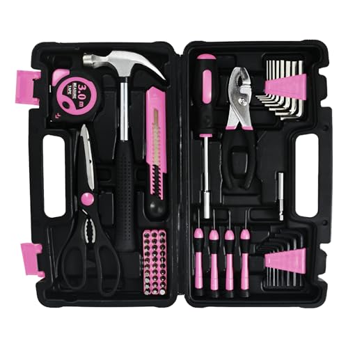 KASAFE 57-Piece Pink Tool Kit Basic Home Repair Tool Set, General Household Hand Tool Kit,Small Tool Kit with Plastic Toolbox Mini Tool kit for Women, Office & College Repairs