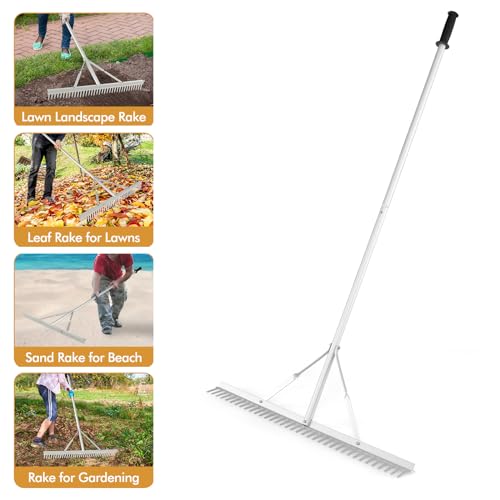 KLYDBMYT 36'' Aluminum Landscape Rake, 36 Tines Garden Rake with 68" Handle & Double-ided Head, Heavy Duty and oil Rake Tool for Leveling Lawn Gathering Leaf Beach Lake