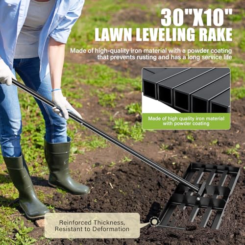 - 【Wide Applications】- The compact and unique design allows our leveling rake for soil to be used on any type of farms, gardens, lawns, golf courses and other grassy areas, it can effectively handle different types of lawn vegetation, spreading topsoil, mixing soil and fertiliser and levelling the ground.