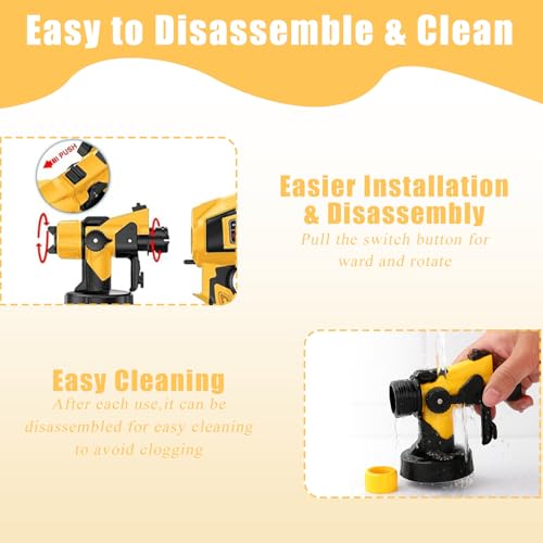 • BEGINNER'S DREAM PAINT SPRAYER: The fence paint sprayer features a streamlined unibody design with tool-free assembly and intuitive controls—ideal for beginners. Prior to spraying, utilize the paint sprayer to blow dust away for an enhanced finish. Post-painting, dismantle the motor for cleaning. The included brush and needle effectively clear hardened paint from the nozzle, facilitating straightforward and efficient cleaning