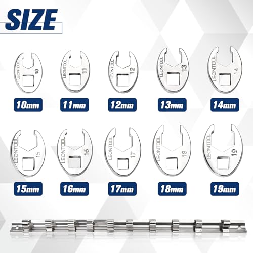 LEONTOOL 10 Pieces 3/8" Drive Crows Foot Wrench Set Metric 10-19mm Flare Nut Wrench Set, CR-V Steel Crowfoot Wrenches Open End Wrenches with Storage Rail for Nut Removal Automotive Plumbing Repair