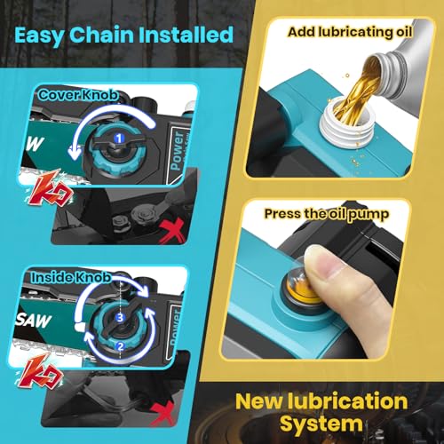 - Automatic Lubrication & Automatic Tension Adjustment: Battery chainsaw adopts automatic lubrication system, just fill the lubricant into the oil pot, press the oil pump, you can lubricate the chain, simple and easy to use, say goodbye to the traditional complex lubrication operation, chain saw with lubricant level display on the side for clear monitoring of the lubricant level, paired with automatic chain tightening function, two buttons can easily adjust the chain tension in just one second.