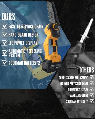 - 【Efficient and Durable Performance】Equipped with two 4000mAh batteries, totaling an impressive 8000mAh, this device delivers exceptional endurance. Its 800W brushless motor ensures high-speed operation with minimal friction, reducing power consumption while avoiding overheating and sparks—making it safe to use in sawdust-heavy environments. The chain achieves a top speed of 10 meters per second, allowing it to cut through a 6-inch log in just 8 seconds. It also features a quick-stop function, halting operation within 0.5 seconds of release.