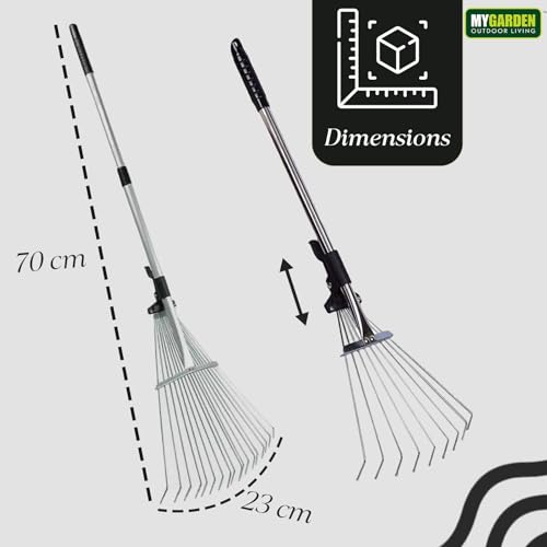 My Garden Rake Telescopic – Adjustable Leaf Rake Metal Lawn Rakes with 9 Teeth – Ergonomic Non-Slip Handle – Extendable Garden Rakes for Grass, Soil, and Debris Cleaning