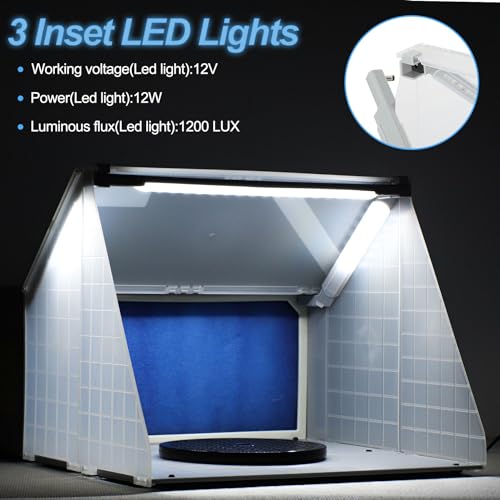 - * Ample and Lighted Work Space: Measuring 41.7cm (W) x 33.8cm (D) x 34.3cm (H) workspace, our sprayer booth provides spacious room for your projects. Equipped with three integrated LED light strips, delivering 1200LUX, it ensures optimal visibility from all angles for clear and precise.