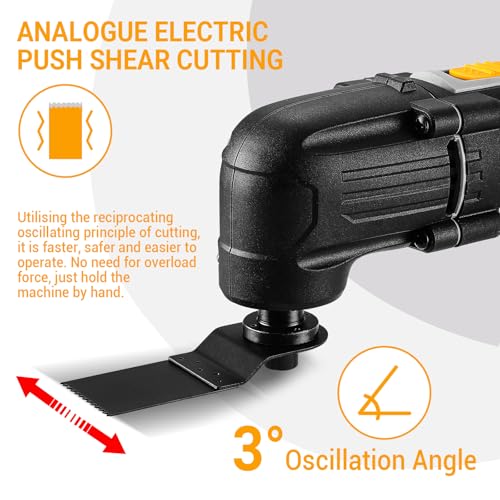 • Unbeatable Power for Diverse Applications: The DEKOPRO oscillating multi tools is powered by a robust 300W motor, delivering an impressive oscillation speed of 3000-22000RPM. This versatile oscillating saw can effortlessly handle cutting, wood cutting, scraping and grinding across various materials such as wood, pipes, tiles and nails. The powerful motor ensures smooth and efficient operation for all your DIY and professional projects.