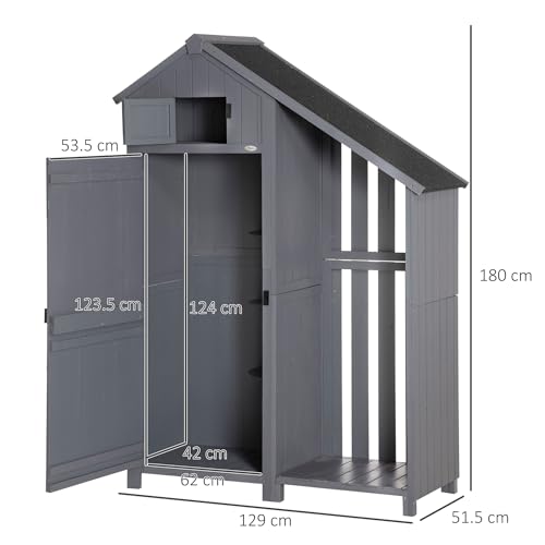 Outsunny Wooden Garden Storage Shed with 3 Shelves, Outdoor Garden Tool Storage Cabinet with Tilt Roof, Firewood Rack Log Carrier, 129 x 51.5 x 180cm, Grey