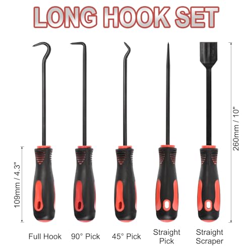 • 11PCS HOOK & PICK UP KIT – 4pcs 6.5-inch mini hooks (full hook, straight pick hook, 45-degree hook, and 90-degree hook); 4pcs 10-inch large hooks (full hook, straight pick hook, 45-degree hook, 90-degree right-angle hook); 1pc 10-inch precision scraper and 1pc 7.7 telescopic magnetic pick-up tool with LED light.