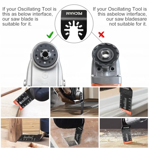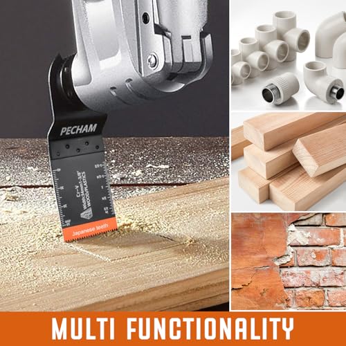 - 【High Quality Oscillating Tool blades】 – PECHAM 19PCS oscillating saw blades are made of High Carbon Steel and Stainless Steel, Tougher and thicker than most. Japanese tooth multitool blades are coated with an electrophoretic orange coating which protects against corrosion. Oscillating blades featured high heat resistant material, wear resistance, tough and long-lasting, easy cutting and long service life. Enjoy saw blades incredible cutting experience.