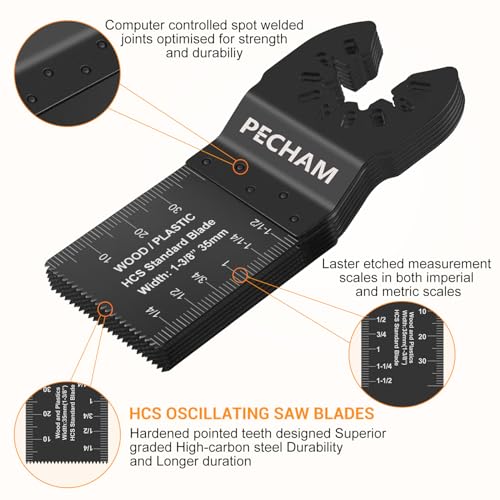 - 【High Quality Multiool Blades】 – PECHAM 37 PCS oscillating saw blades are made of High Carbon Steel and Stainless Steel, Tougher and thicker than most. The multitool blades are coated with electrophoretic black finish which protects against corrosion. Oscillating blades featured high heat resistant material, wear resistance, tough and long-lasting, easy cutting and long service life. Enjoy saw blades incredible cutting experience.