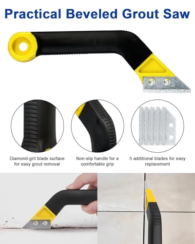 - 【Beveled Grout Saw】Made of high-quality plastic and hardened metal, 1mm thick, with a beveled handle design for easy access to hard-to-reach areas to remove grout, and a hole at the end for easy storage, it comes with 5 extra blade replacements.