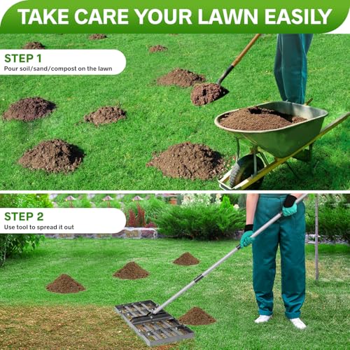 - DURABLE MATERIAL & POWDER COATED The handle of the lawn leveler is made of thickened stainless steel, the base plate is made of solid iron with non-stick coating, durable enough to withstand even the toughest jobs and last for years.