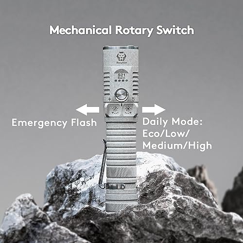 - Simple to Use: Innovative and intuitive mechanical rotary switch(the latest technology) makes the UI simple and easy to use. Left is two signal flash mode for emergency backup and Right is regular beam(Eco /low /medium /high) for daily use. Press and hold the metal switch will activate turbo mode when using. This flashlight should be the easiest one to use among of all your flashlights.