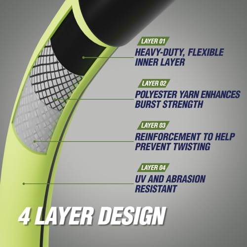 - HEAVY DUTY 4 LAYER DESIGN: ultra strong, heavy duty hose to tackle any outdoor job; abrasion and crush resistant for maximum durability; UV and rust resistant with high quality anodized aluminum couplings for use in all weather