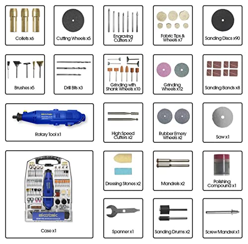 • Comprehensive 234Pc Rotary Multi Tool Set: The Skotek rotary tool comes with 1x saw blade, 1x polishing compound, 1x spanner, 1x screw mandrel, 2x mandrels, 2x high speed cutters, 2x rubber emery wheels, 2x sanding drums, 2x dressing stones, 3x drill bits, 5x cut off wheels fiberglass, 5x brushes, 6x collets, 7x diamond engraving cutters, 7x fabric tips & wheels, 8x sanding bands, 10x grinding with shank wheels, 12x grinding wheels, 60x cutting discs, 96x sanding discs.