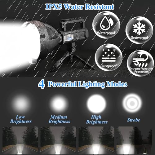 【2,000,000 Lumens Rechargeable Handheld Spotlight Flashlight】 2,000,000 high lumens super bright Led spot light uses upgraded aggregated LED chips. The Max beam distance is up to 1300 meters (4265 feet). The powerful spotlight provides a super bright light in the darkness.