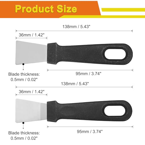 - Cleaning Scraper Size: width: 36mm / 1.42 inch; thickness: 0.5 mm / 0.02 inch; Handle length: 95 mm / 3.74 inch; Total length: 140 mm / 5.51 inch.