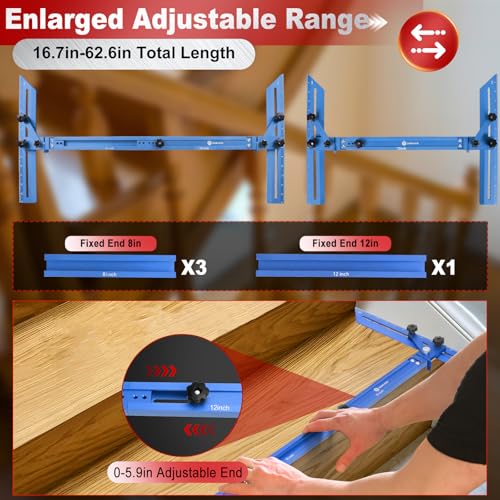 Stair Tread Template Tool, Stair Tread Gauge Measuring Tool Jig with Track, Angled Brace, Flip-Stop, Adjustable Length 16.7" to 62.6" Compatible with Many Types of Layout Projects