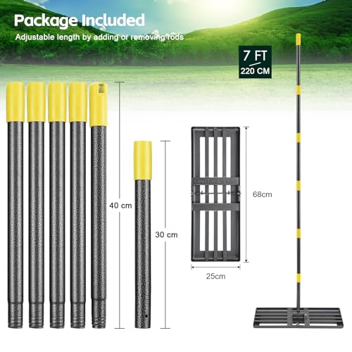Starbover Foldable Lawn Rake with Handle, 220 cm Lawn Rake Lawn Leveling Rake, Black Metal, Robust Floor Lawn Planner Tool, Lawn Pusher for Yard, Golf, Garden, Backyard