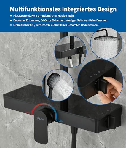 Süßren Shower System,Mixer Shower Set with 35×14cm Glass Shelving Unit,Rainfall Shower Head,3 Modes Handheld Showerhead,Bottom Outlet,Height-Adjustable Stainless Steel Shower Set (Black)