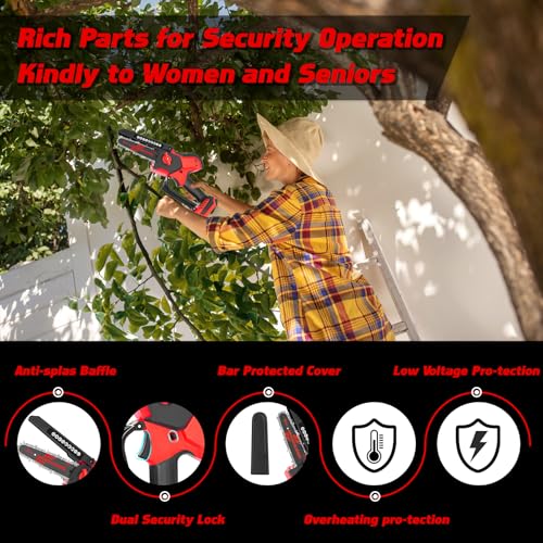 - Multiple Features for Security Usage: We take your saftey seriously! The mini electric chainsaw fitted with the Security Lock prevents accidental activation. You must press the security lock firstly, then press the power switch to start. Plus, the black guard will continue to shield your saftey during the cutting process