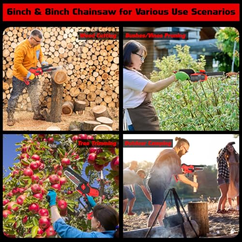 - Useful 2-IN-1 Min Chainsaw: TAIRDA cordless chainsaw provides you 8-inch and 6-inch sizes bar, 2-in-1 unique design meets various cutting projects, like cutting diameter from 1 inch to 8 inches, cutting pieces, slices or chunks without problem. Wide used in your Yard, Gardens, Ranch, Fireplace, Camping for Tree Trimming, Branches Pruning, Wood Cutting, etc
