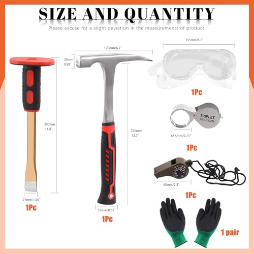 - Package Includes: You’ll get 6pcs professional geology tool kit, including 1pc flat chisel, 1pc rock hammer, 1pc whistle, 1pc jewelers loupe, 1pc safety glasses and 1 pair of gloves. Nice combination can meet your daily use.