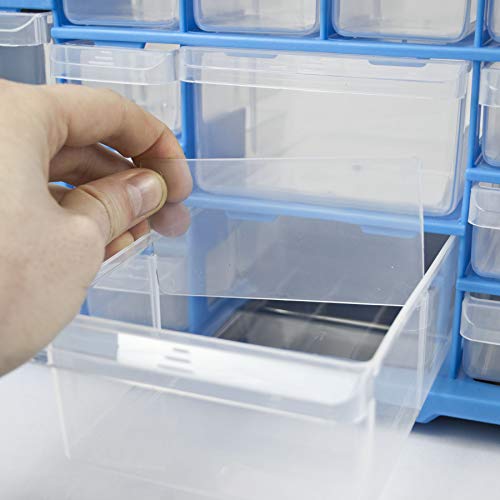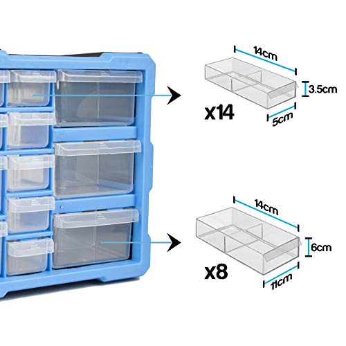 - DRAWER DIMENSIONS – The smaller drawers measure 5cm x 3.5cm and are 14cm deep, making them perfect for screws, washers and other small items. The larger drawers below measure 11cm x 6cm and are also 14cm deep